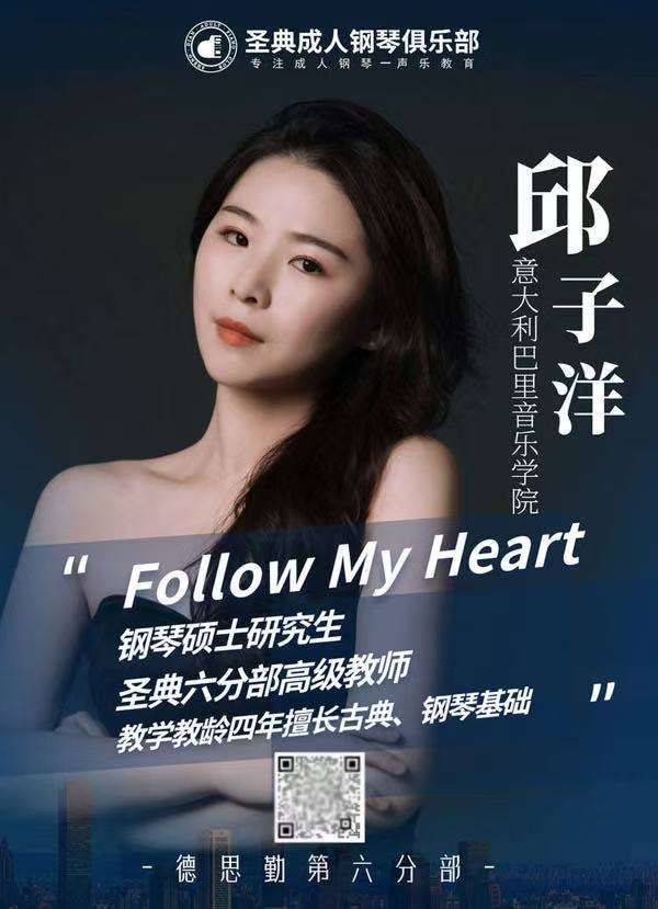 意大利巴里音乐学院钢琴硕士研究生,圣典六分部高级钢琴教师,教学教龄四年擅长古典、钢琴基础。
